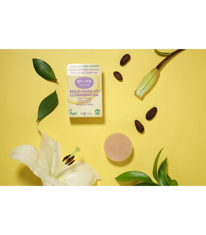 El aceite desmaquillante natural y sólido de Balade en Provence ofrece una limpieza suave y natural, ideal para todo tipo de piel, incluso la más sensible. Su fórmula enriquecida con aceite de jojoba y aceite de girasol hidrata y protege la piel mientras elimina eficazmente el maquillaje, incluido el resistente al agua. La manteca de cacao aporta nutrición y suavidad, mientras que la flor de lirio blanco calma y la arcilla rosa purifica sin resecar. Sólido, vegano y con certificación ecológica, es perfecto para quienes buscan una rutina de belleza respetuosa con la piel y el medio ambiente.