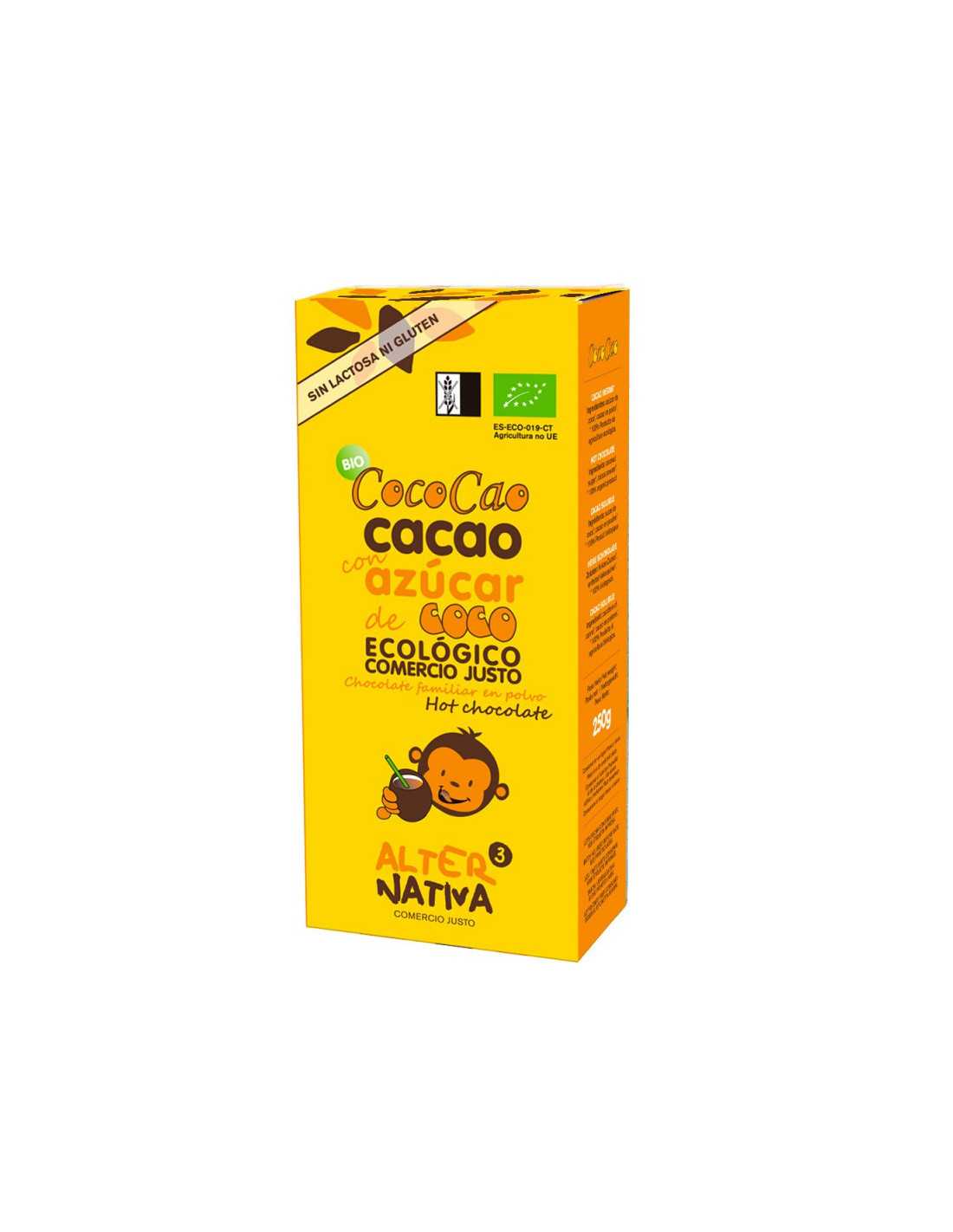 Cacao procedente de República Dominicana con azúcar de coco, que se produce de la savia de las flores de la palmera de cocos que crecen en abundancia en los climas tropicales.Sin gluten, ni colorantes ni conservantes. El azúcar de coco tiene un índice glucémico bajo (35) lo que ayuda a evitar que los niveles de azúcar en sangre se disparen rápidamente al consumirlo.Más información sobre el producto y sus productores en la web: alternativa3.comPreparación: Poner 2 o 3 cucharadas en una taza o vaso. Añadir un poco de leche caliente o fría, remover bien y agregar el resto de leche.Sin lactosa y sin glutenSe presentan en caja de cartón reciclado de 250g.Info Nutricional por 100g de Cacao| Valor energético | 1606kJ / 383 kcal |