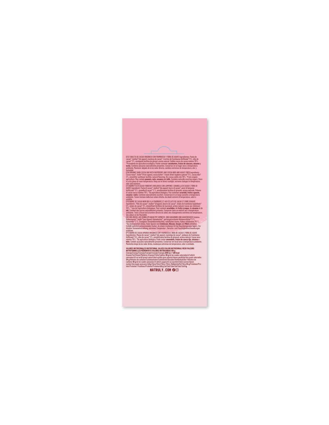 Pasta de cacao*, inulina* (de agave), manteca de cacao*, trocitos de frambuesa liofilizada* 5%, nibs de cacao* 3%, emulgente lecitina de girasol, aroma natural. Sólidos secos de cacao mínimo 70%.
