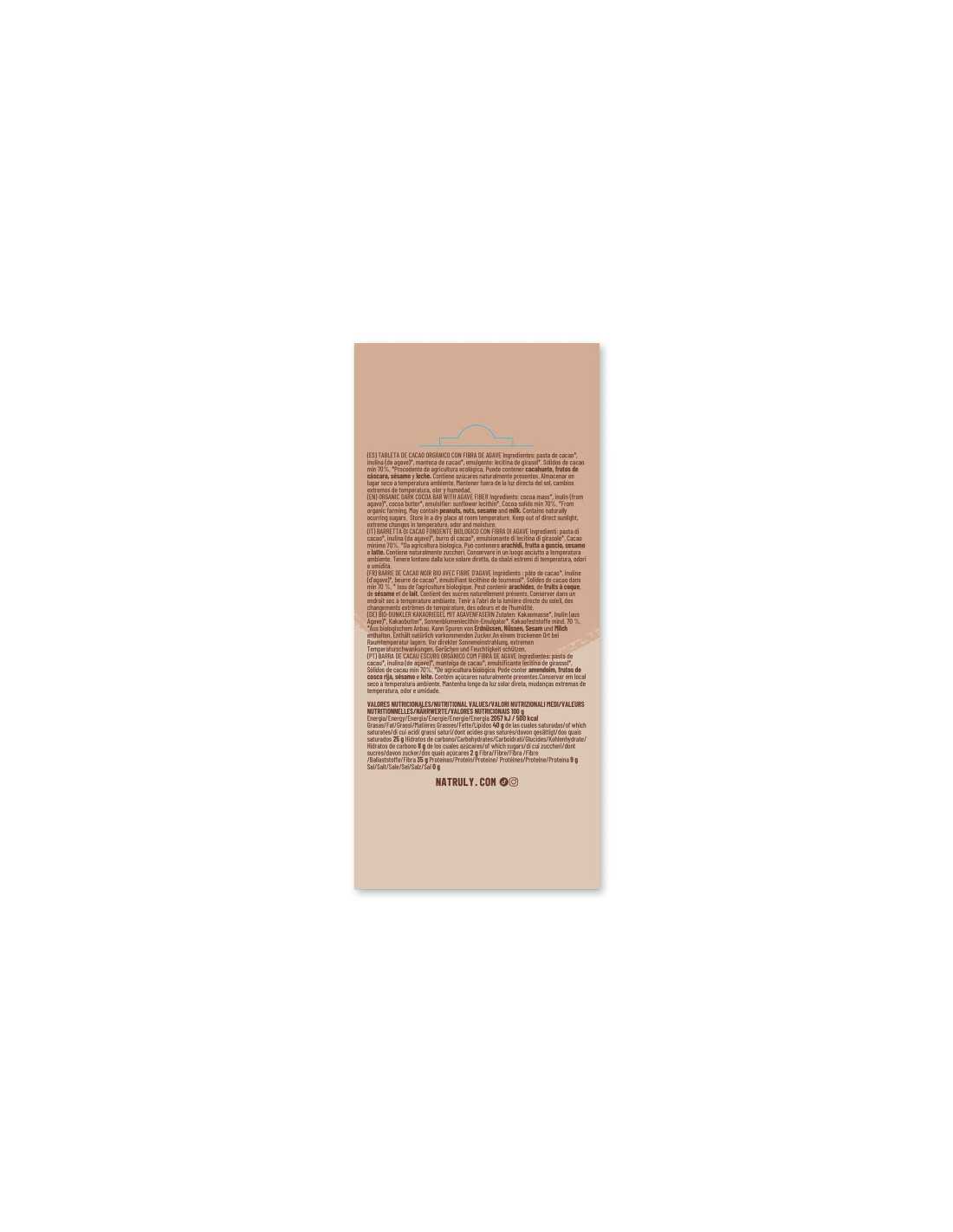 Pasta de cacao*, inulina (de agave)*, manteca de cacao*, emulgente: lecitina de girasol*. Sólidos de caco min 70%.