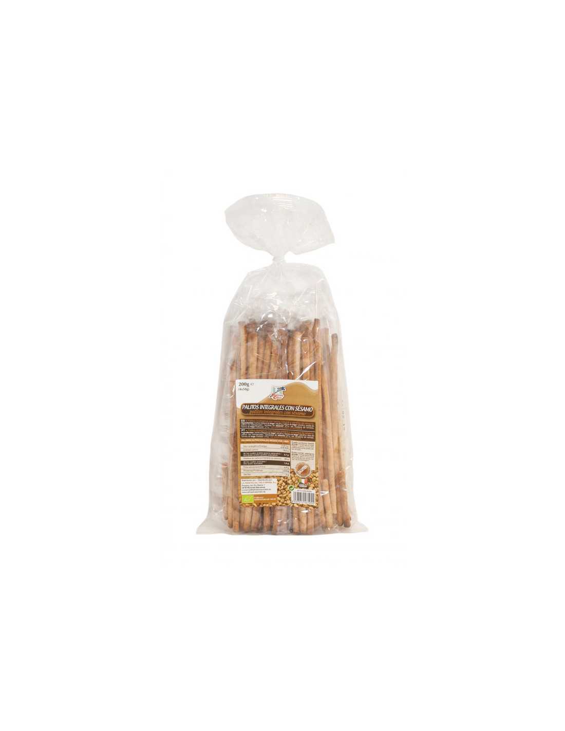 Grissines integrales con sésamo procedentes de agricultura ecológica. Sabrosos y crujientes, elaborados con harina integral y aceite vegetal. La bolsita contiene 4 raciones de 50 gramos.