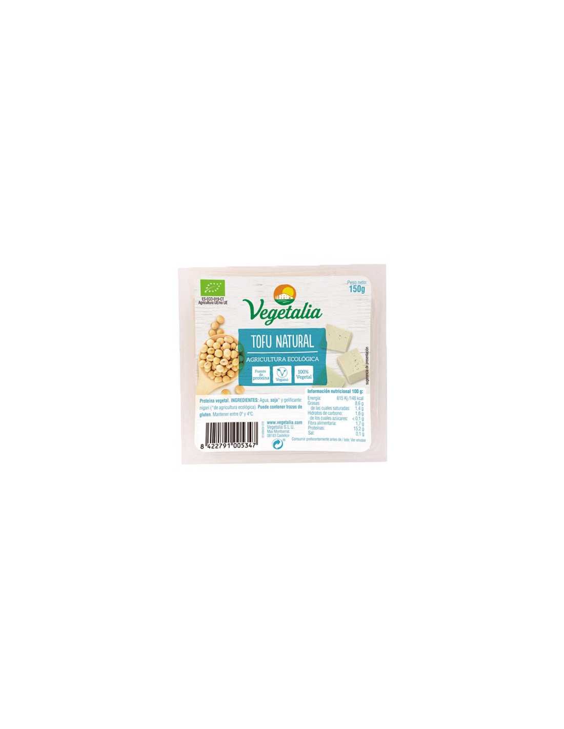 El tofu bio de Vegetalia es un producto de agricultura ecológica. Es el cuajo que surge al cortar la leche de soja, tiene un contenido en calcio superior a la leche de vaca. Contiene un elevado porcentaje de proteínas de excelente calidad y los 8 aminoácidos esenciales, también es rico en minerales y vitaminas. Es un producto fresco, no contiene lactosa ni huevo y es 100% vegano.Ingredientes:
