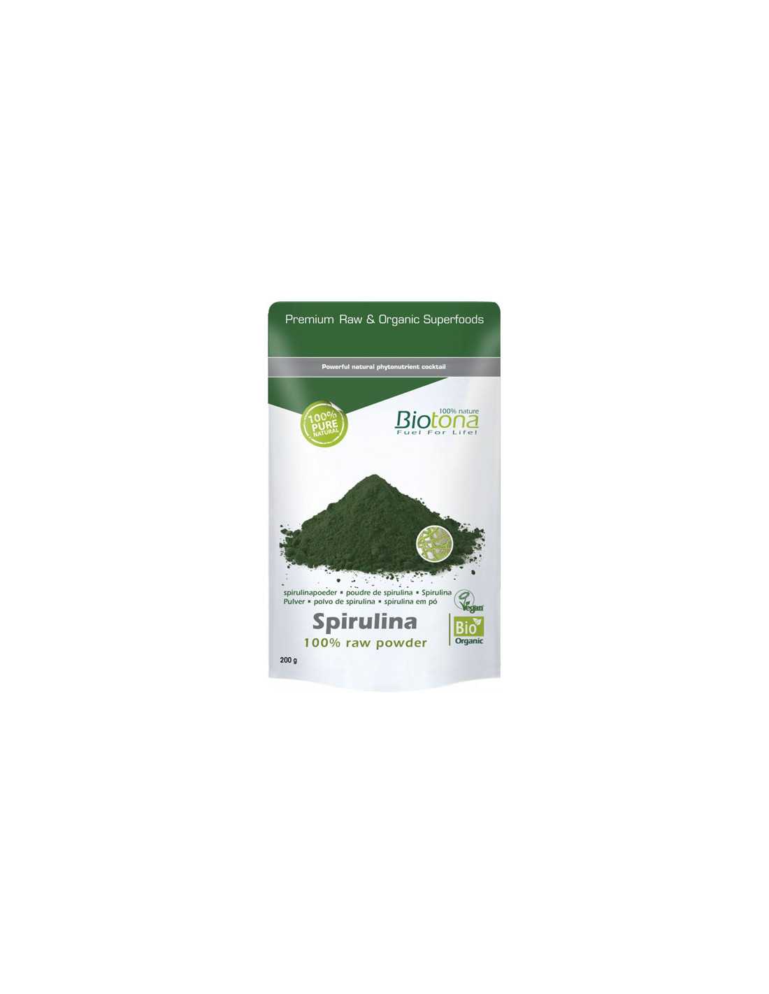 La espirulina es un alga de agua salada de un color verde azulado y con forma de espiral. Usado desde milenios como fuente de alimento. Este alga contiene un verdadero tesoro de fitonutrientes y constituye la fuente de proteína más concentrado que se conoce hasta nuestros días (hasta un 70%). La spirulina mantiene la vitalidad en general. Biotona Bio Spirulina Raw se produce a base de algas 100% biológicas, cultivadas al aire libre y con sol intenso. Después de recogerlas, estas algas se someten a un proceso de secado superior al normal, lo cual garantiza la conservación de su valor nutricional.