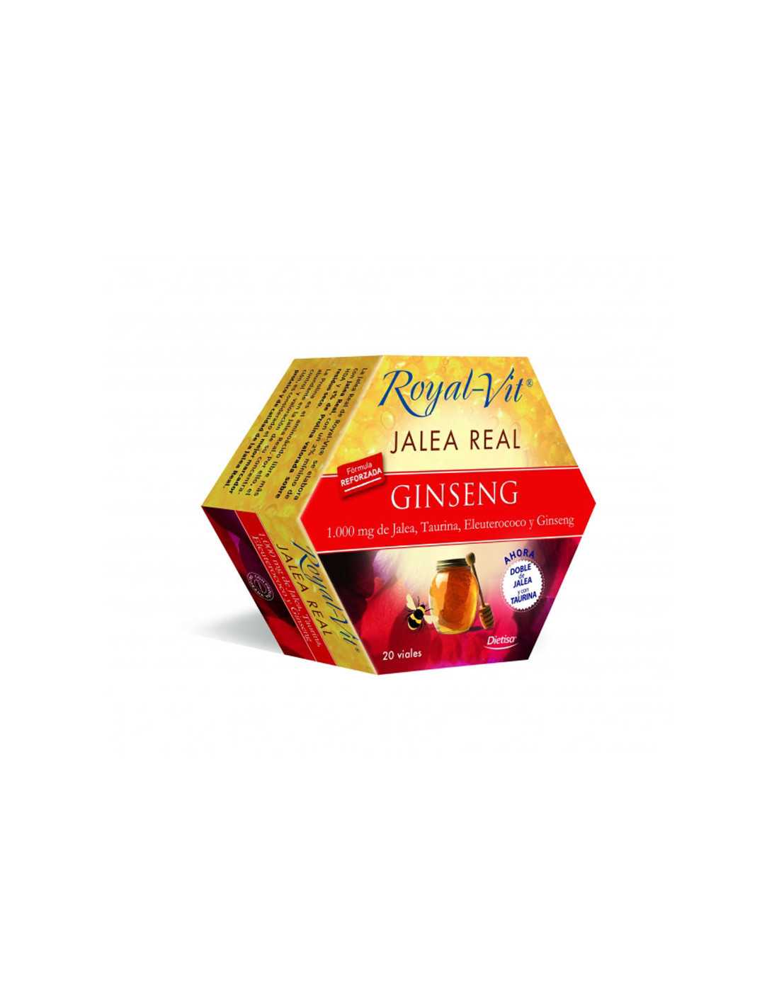 Royal-Vit® Jalea Real con GINSENG es un complementyo alimenticio con jalea Real, Taurina, Eleuterococo y Ginseng, aportando por vial:1.000 mg de Jalea Real (con 1% de Prolina valorada sobre residuo seco)500 mg de Ginseng y 100 mg de EleuterococoLa fórmula se completa con Taurina para potenciar el efecto natural del ginseng.Ingredientes: