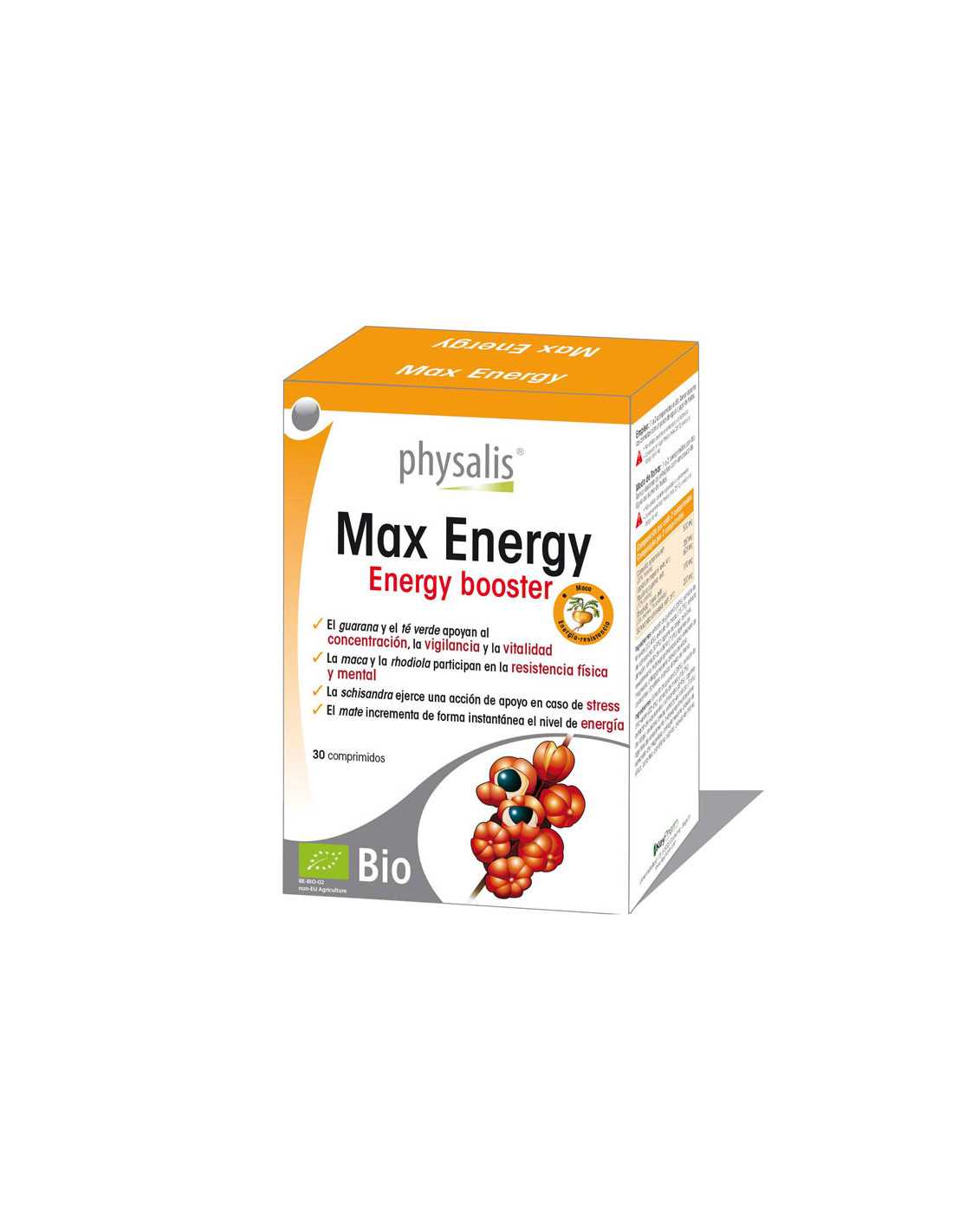 Complemento alimenticio a base de plantas¿Falta de ?marcha?, baterias descargadas, desanima- do, agenda cargada? ¿Necesita un empujón de energía? Physalis Max Energy bio es un complemento poderoso con extractos biológicos de alta calidad. El guaraná y té verde por una parte apoyan la concentración y la atención, y por otra contribuyen a la vitalidad. Ambas plantas son fuentes naturales de cafeina. Contiene maca, una planta con resistencia excepcionaly que, como la rhodiola, asiste al cuerpo y a la mente después de esfuerzos intensos. La schisandra ejerce igualmente una acción de apoyo mientras que el mate aumenta de forma inmediata el nivel de energía. Con el extracto de amla, también llamada grosella india, estandarizada a un 50% de vitamina C natural que participa en la redución de la fatiga y apoyo al sistema nervioso.- El guarana y el té verdeapoyan al concentración, la vigilancia y la vitalidad
