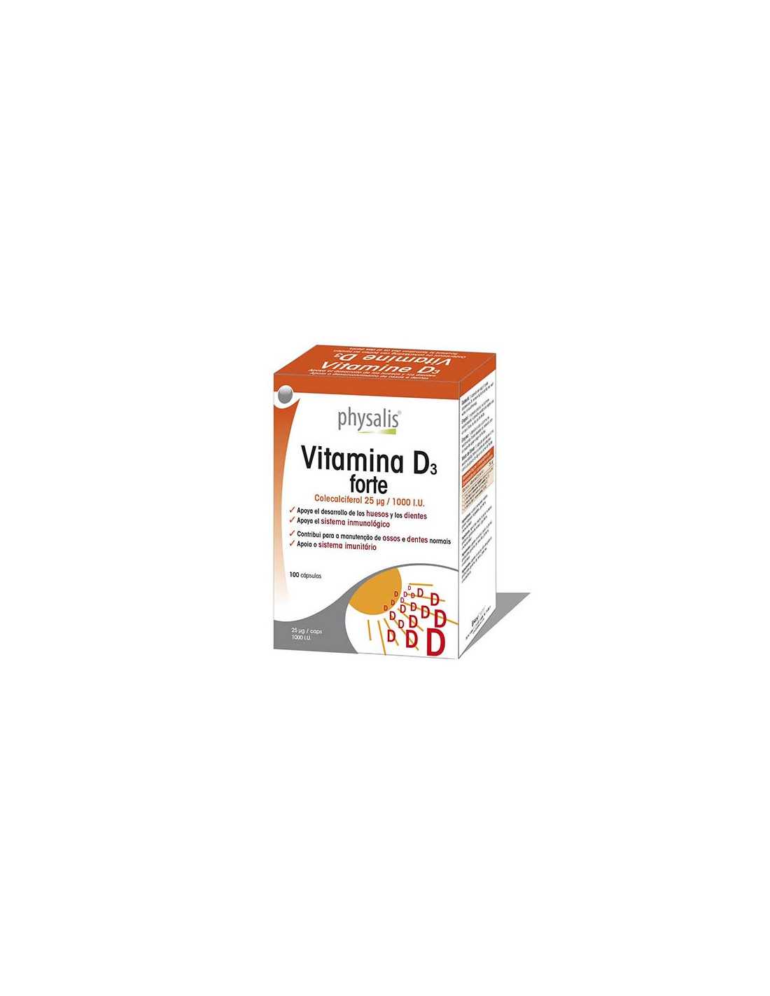 Complemento alimenticio a base de nutrientes. Nuestro organismo fabrica por si mismo la vitamina D3, pero la producción puede resultar irrelevante en especial en los meses de menos sol.Physalis Vitamina D3 forte contribuye a mantener el sistema óseo y los dientes en buen estado y ejerce una influencia positiva en el sistema inmunitario.Un suplemento en vitamina D3 se recomienda frecuentemente, sea en la nutrición de niños (a partir de 3 años) o adultos (especalmente las personas mayores) como en las mujeres embarazadas o en periodo de transición.- Apoya el desarrollo de los huesos y los dientes.- Apoya el sistema inmunológico.- Extra fuerte: 25 µg / capsIngredientes: