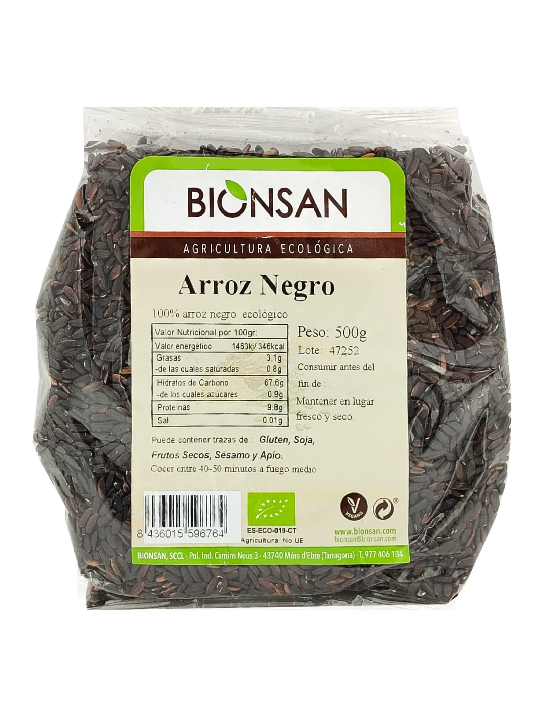 El arroz negro ecológico tiene un olor a nuez, textura arrugada y cuando se cocina adquiere un tono morado. Es muy nutritivo, destacando por ser el arroz con menos cantidad de calorías por porción y una mayor cantidad de fibra y proteínas. Es rico en betacarotenos, en vitaminas B1 y B2, fósforo, potasio, hierro y calcio.. Ayuda a regular los niveles de colesterol y es un buen protector hepático.