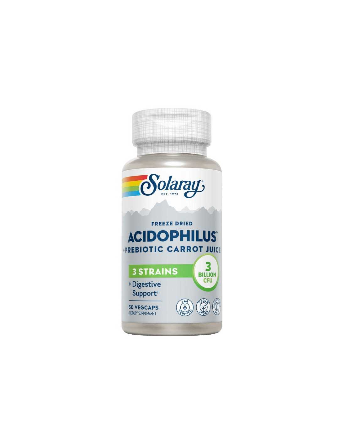 Diseñado para funcionar mejor, cada cápsula vegetariana de Solaray Acidophilus Formula contiene una mezcla de más de tres mil millones de células probióticas de L. acidophilus, L. bulgaricus y S. thermophilus vivas en el momento de la fabricación. Además, se presenta en una base prebiótica de jugo de zanahoria en polvo para una mayor potencia. Cada cepa está presente en un estado liofilizado y la fórmula en su conjunto puede ayudar a mantener un tracto digestivo saludable.