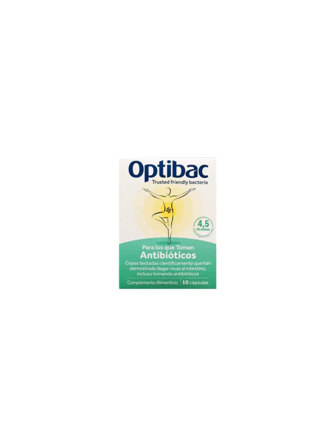 Optibac "Para los que Toman Antibióticos" es un complemento alimenticio probiótico formulado para preservar el equilibrio intestinal durante los tratamientos con antibióticos. Cada cápsula contiene 4,5 mil millones de microorganismos vivos de cepas seleccionadas científicamente para garantizar que llegan vivas al intestino, incluso mientras se consumen antibióticos.