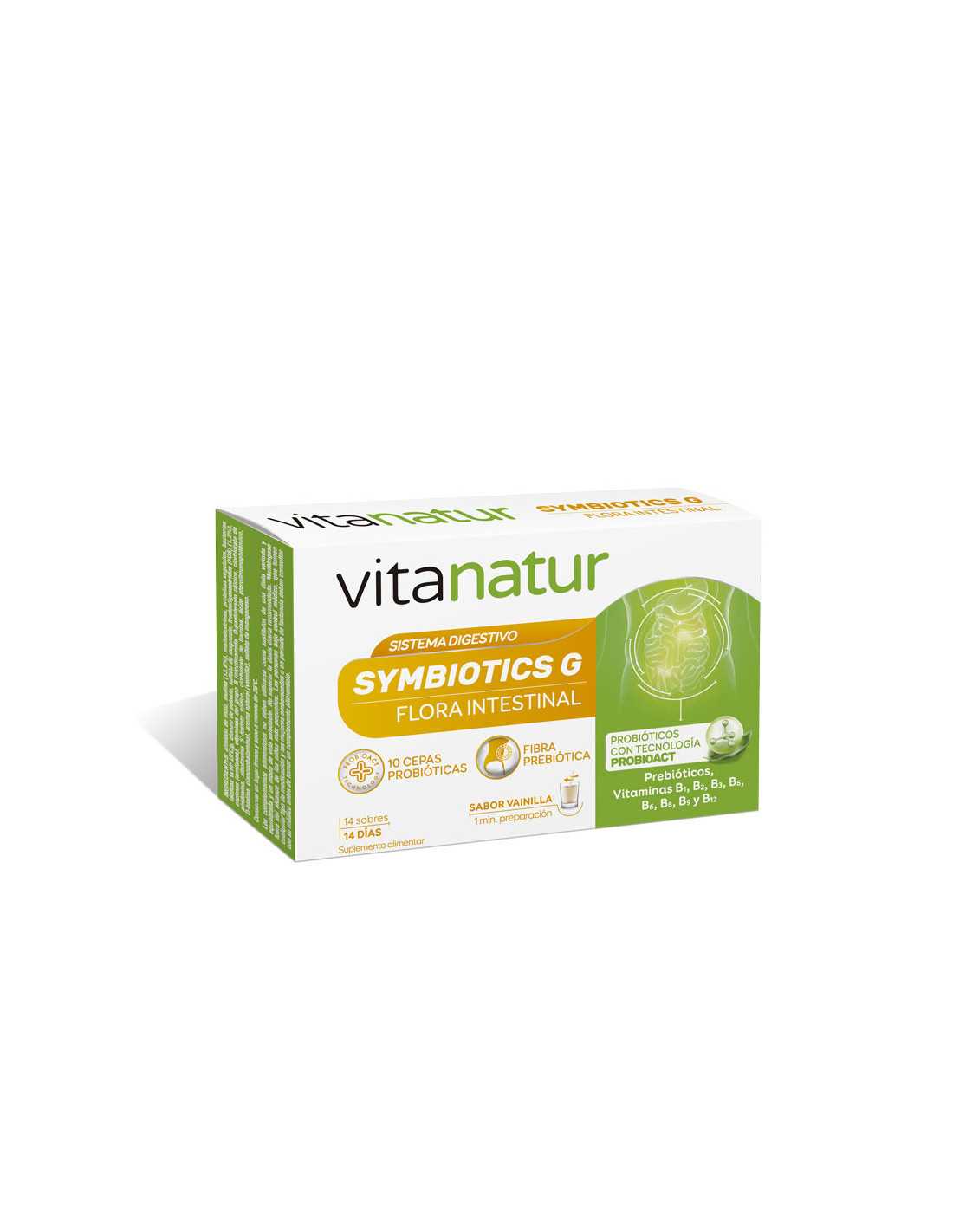 VITANATUR SYMBIOTICS G es una combinación de prebióticos, probióticos y vitaminas del grupo B que ayuda a restablecer y mantener el equilibrio de la flora intestinal.