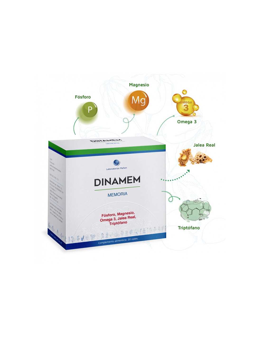 Entre los ingredientes destacan el fosfatidilserina, la jalea real liofilizada y la glutamina, reconocidos por sus beneficios para la función cerebral, la concentración y el rendimiento cognitivo. Esta fórmula también incluye EPA (omega 3) y triptófano, potentes antioxidantes que protegen las células cerebrales del estrés oxidativo y el envejecimiento. Dinamem se presenta en prácticos viales que facilitan su dosificación y absorción, brindando un soporte completo para la salud cerebral y la memoria.