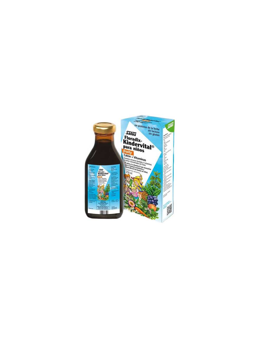 Floradix-Kindervital fruity es un delicioso complemento alimenticio para niños que aporta calcio y nueve vitaminas. El calcio y la vitamina D son necesarios para el crecimiento y desarrollo de los huesos. Además las vitaminas esenciales contenidas ayudan a varias funciones importantes en el organismo, como es el caso de las vitaminas B2, B6 y C que contribuyen a un normal mantenimiento del sistema inmunológico. Floradix-Kindervital es fácil de tomar y ayuda a proteger el equilibrio entre el calcio, vitaminas A, D, E, C, B1, B2, niacina, B6 y B12. Gracias a que estos nutrientes llegan al intestino ya disueltos en un medio líquido son absorbidos más rápidamente que otras formulaciones secas (por ejemplo comprimidos). Además contiene diversos zumos concentrados verduras y hierbas selectas que le confieren un agradable sabor.