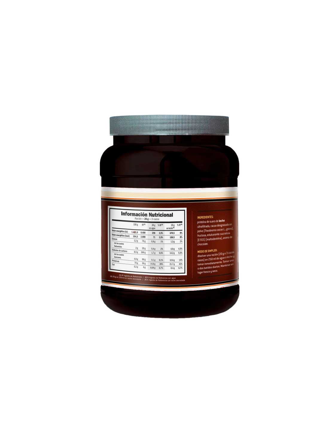 Proteina de suero de leche ultrafiltrada, cacao desgrasado en polvo (theobroma cacao L), frutosa, edulcorante: sucralosa (E955) (maltodextrina), aroma de chocolate