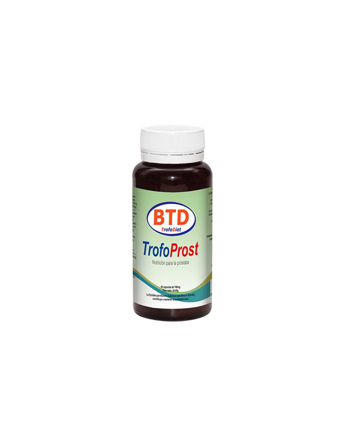 Las cápsulas TrofoProst de BTD son un remedio natural nutricional para la salud de la próstata.Complemento alimenticio a base de extractos de plantas y nutrientes sinérgicos, con reconocido uso en el tratamiento de diversos trastornos asociados al crecimiento y salud de la próstata.Su uso es recomendado en trastornos inflamatorios, como la hiperplasia benigna prostática (HBP), y como preventivo en las intervenciones y correcciones quirúrgicas asociadas a los trastornos producidos por el incremento del tamaño de la glándula prostática.Propiedades: