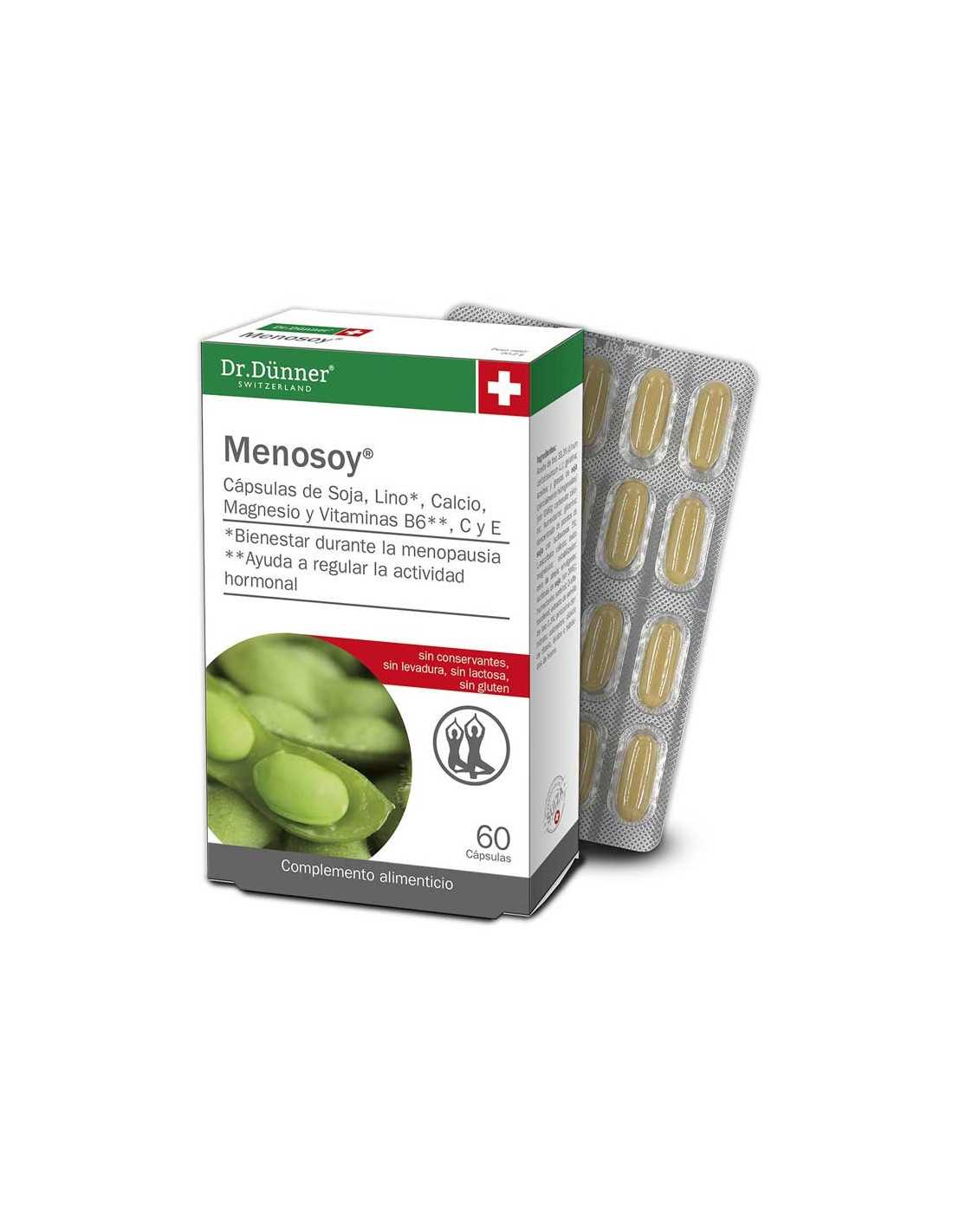 Menosoy está elaborado a base de un concentrado de soja rico en isoflavonas. Además contiene semillas de lino así como aceite de lino ricos en lignanos que son beneficiosos para la salud de la mujer en la menopausia. Además la fórmula incorpora los minerales calcio y magnesio que contribuyen al funcionamiento normal de huesos y músculos.