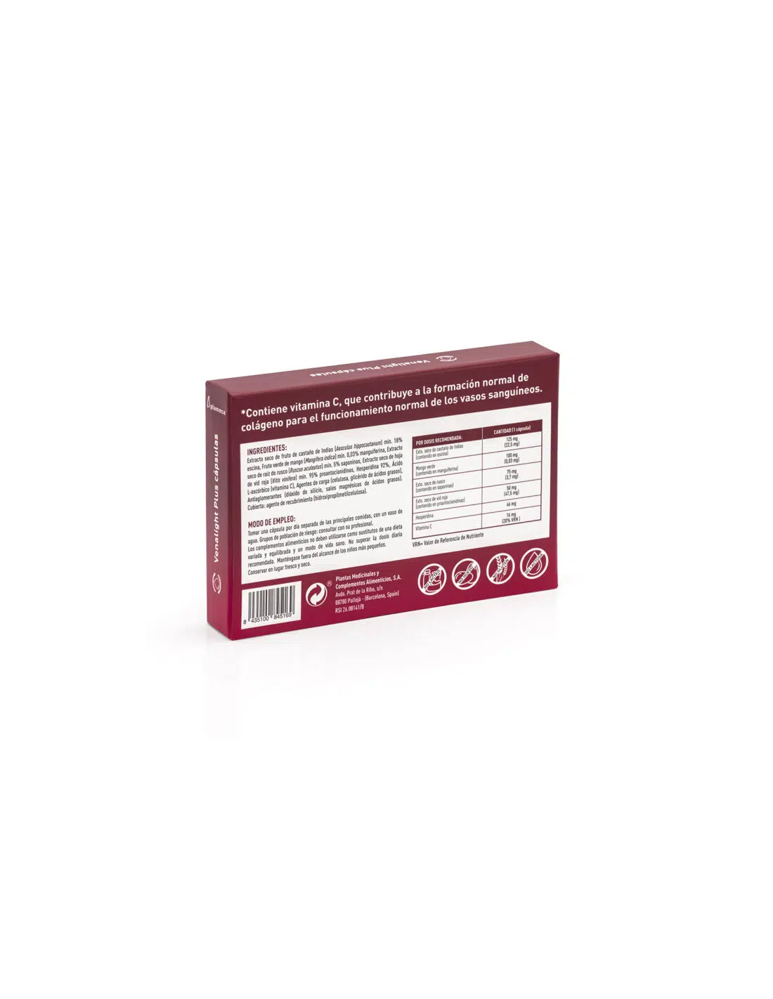 Venalight Plus es un complemento alimenticio formulado para favorecer el bienestar venoso y la salud de los vasos sanguíneos. Su composición combina ingredientes reconocidos por su acción protectora del sistema circulatorio, como la vitamina C, el castaño de Indias y la vid roja, reforzados con extracto de mango verde, rusco y hesperidina.