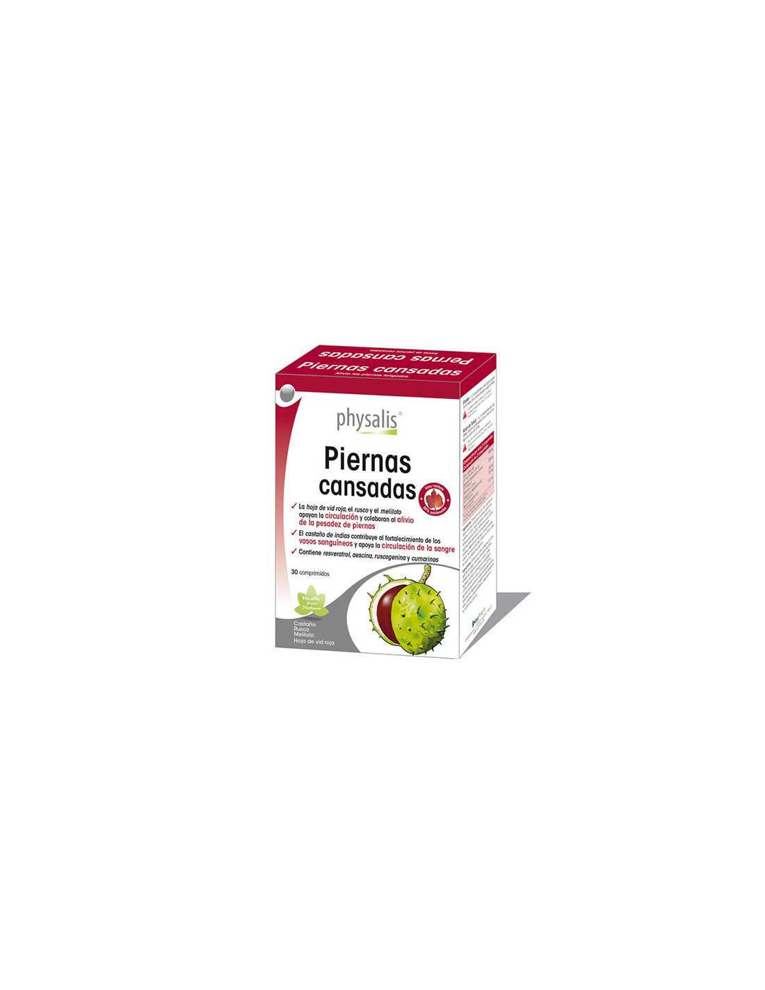 Physalis Piernas Cansadas alivia la pesadez en las piernas. ¿Sensación de pesadez en las piernas? ¿Piernas fatigadas? Las personas mayores o que están de pie o sentadas de manera prolongada sufren estas sensaciones a menudo. Estas molestias se deben a una mala circulación en las piernas. La hoja de vid roja es rica en polifenoles que favorecen la circulación y mantienen las piernas en buen estado. El rusco, el castaño y el resveratrol complementan esta acción. La Vitamina C es un potente antioxidante.Evite estar de pie o sentado prolongadamente, haga suficiente ejercicio físico, duerma con las piernas ligeramente elevadas, evite el café, el alcohol?