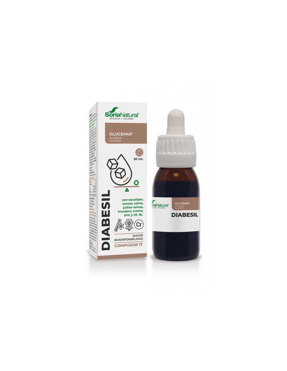 Composor Diabesil 17 Complex de Soria Natural es una fórmula líquida sin alcohol a base de extractos vegetales y micronutrientes, diseñada para ayudar a mantener niveles normales de glucosa en sangre. Contiene eucalipto, canela, salvia, judía vaina, travalera, zinc, cromo y vitamina B3, todos seleccionados por sus beneficios sobre el metabolismo de los hidratos de carbono y el equilibrio glucémico. Gracias a su tecnología con ciclodextrinas, ofrece una mayor biodisponibilidad y eficacia, garantizando el aporte de principios activos en cada toma. Está formulado en glicerina vegetal, lo que lo hace apto para quienes desean evitar el alcohol en los complementos.