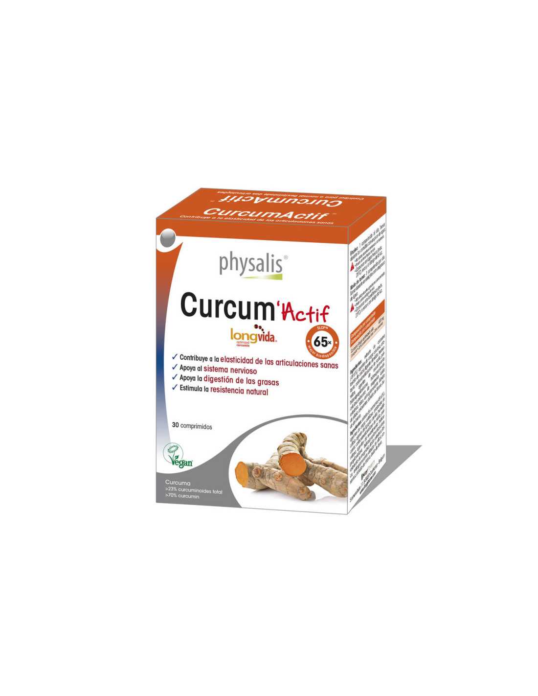 Complemento alimenticio a base de plantasPhysalis Curcum?Actif contiene 400 mg de Longvida®, un complexe de curcuminoides patentado habiendo sido objeto de numerosos estudios. Su fórmula exclusiva bajo forma de micropartículas liposolubles (Solid Lipid Curcumin Particle technology o SLCPTM) hace de esta suerte que la curcumina sea 65 veces mas biodisponible que bajo su forma no optimizada. La raíz de curcuma longa no es solo una especia muy apreciada en cocina, sino además una excelente planta medicinal que preserva la salud y flexibilidad de las articulaciones, que apoya la función hepática (combustión de las grasas), que contribuye a la salud de la piel y del sistema nervioso y que estimula la resistencia natural.- Contribuye a la elasticidad de las articulaciones sanas