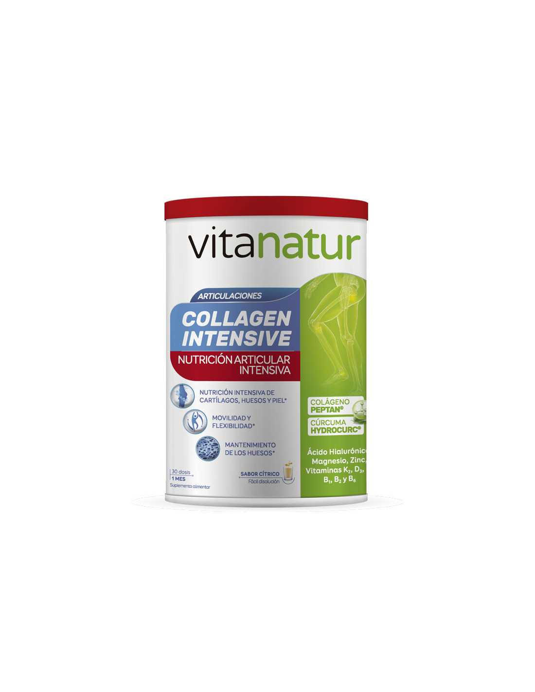 Vitanatur Collagen Intensive es un complemento alimenticio a base de colágeno hidrolizado, extracto de cúrcuma, ácido hialurónico, magnesio, zinc y vitaminas K2, D3, C, B1, B2 y B6