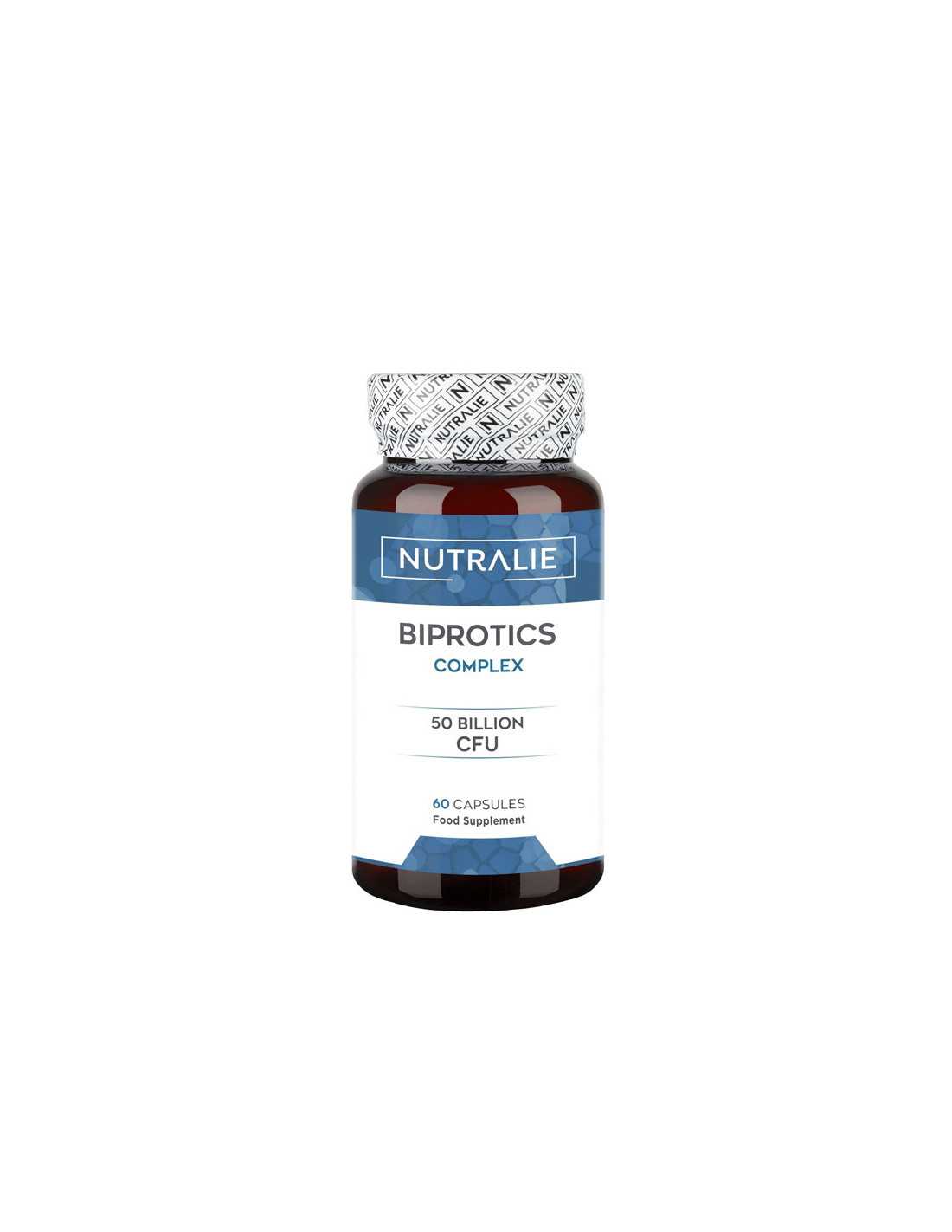 Biprotics Complex de Nutralie es un complemento alimenticio natural con una combinación de 10 cepas, que se complementan entre ellas. Esta combinación proporciona 50 mil millones de UFC garantizadas durante la vida útil del producto. En Biprotics Complex se encuentran cepas que pertenecen al grupo de lactobacilos y bifidobacterias. Por un lado los lactobacilos son un tipo de bacterias benignas que normalmente viven en los sistemas digestivo, urinario y genital. Por otra parte, las bifidobacterias son un tipo de bacteria que se asienta en los intestinos.