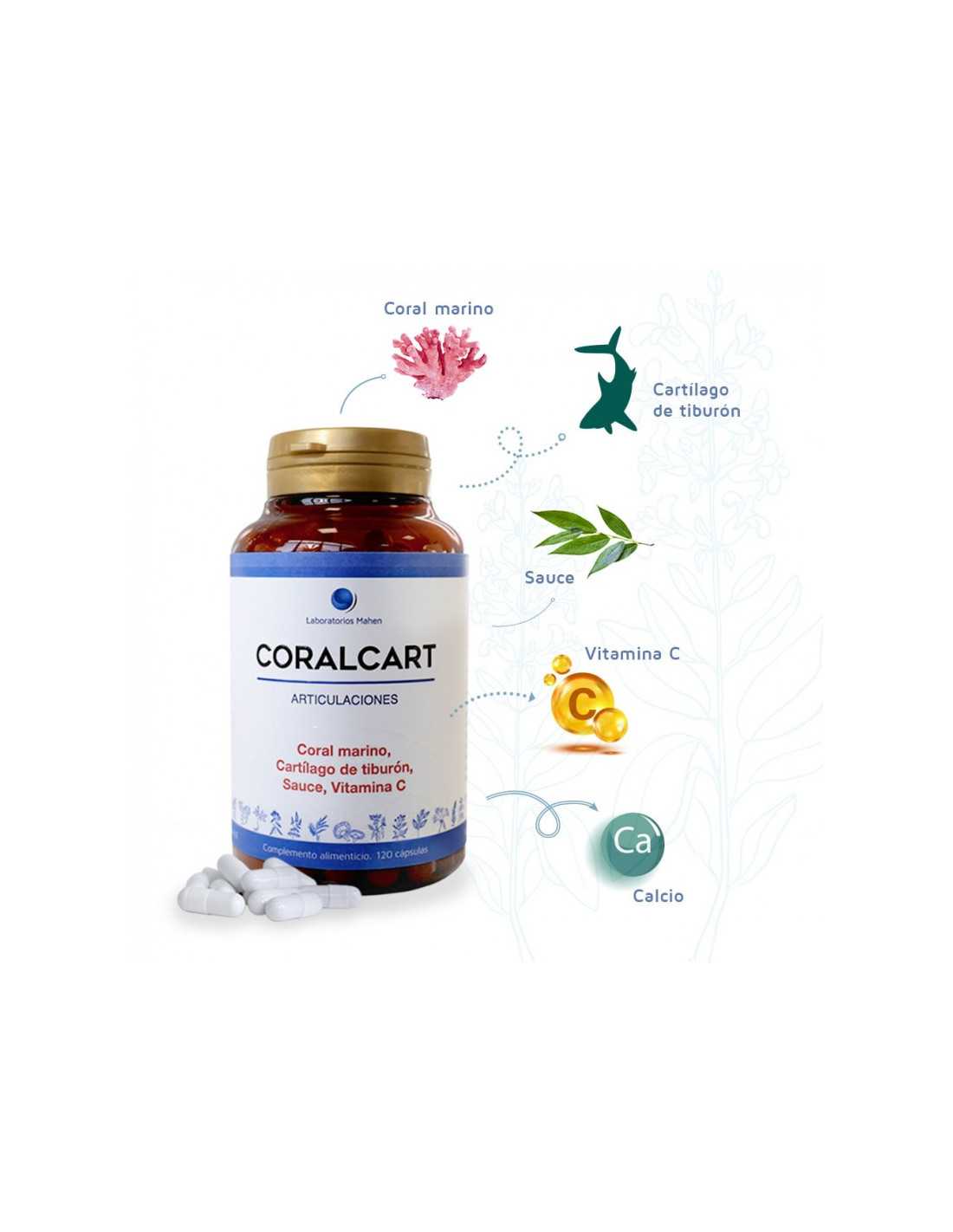 Coralcart de Mahen es un complemento alimenticio que viene en una presentación de 60 cápsulas. Está compuesto por una combinación de coral marino y cartílago de tiburón.