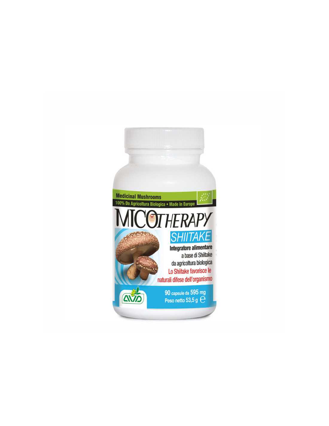 Complemento alimenticio a base de Shiitake (Lentinula edodes) procedente de agricultura ecológica (IT BIO 006) – Hecho en Europa.