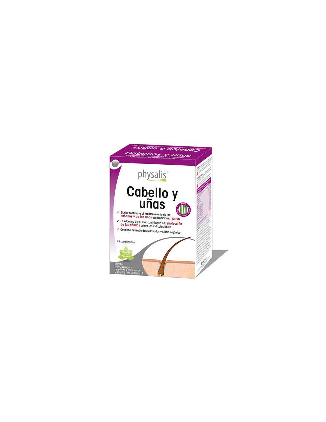 Estrés momentáneo, fatiga pasajera, malos hábitos alimentarios, sol, tintes,? tienen un efecto negativo, que dejan los cabellos y uñas, quebradizos y sin brillo.Physalis Cabellos y uñas es un complexe natural nutritivo que contiene zinc en forma de quelato (biodisponibilidad máxima) que contribuye a la belleza y a la salud del cabello y de las uñas. La biotina (o vitamina H) y la vitamina B6 apoyan el metabolismo de las proteínas mientras que la vitamina C y el zinc participan en laprotección de las células contra los radicales libres. Contiene también silicio orgánico del bambú, un hidrolizado de colágeno, L-arginina, MMS y aminoácidos sulfurados L-cistina y L-methionina.