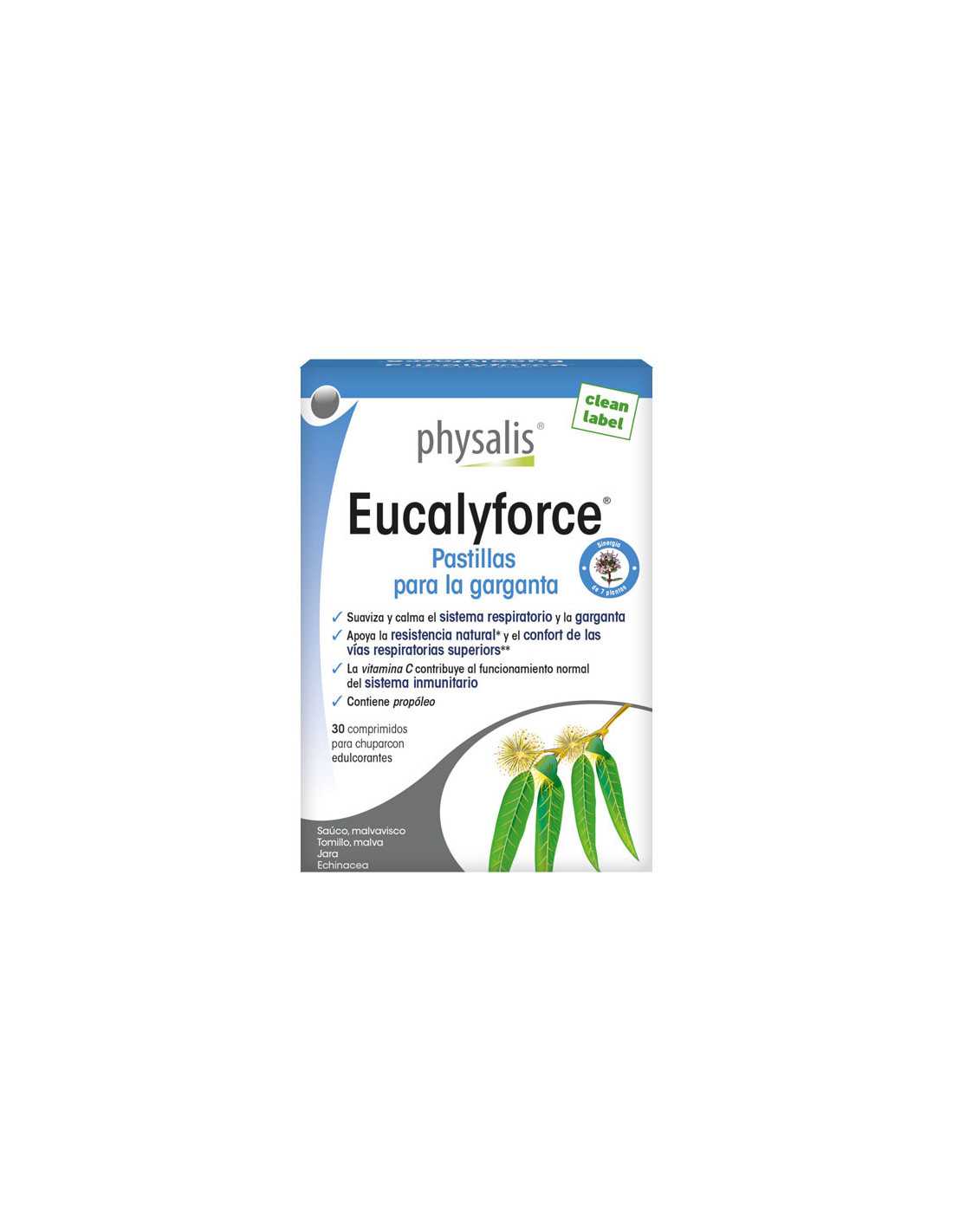 Complemento alimenticio a base de plantas y nutrientes Frío, viento, lluvias, polución.... Nuestras vias respiratorias y nuestra resistencia natural a menudo son sometidas a duras pruebas. Physalis Eucalyforce pastillas para la garganta. ejercen una acción suavizante y calmante en las vias respiratorias y la garganta y refuerzan la resistencia natural. Esta pastilla para la garganta contiene una combinación de extractos de plantas (jara gris, saúco, echinacea purpúrea, malvavisco, tomillo, geranio del cabo), própolis, vitamina C y aceite esencial (eucalyptus) que refuerza el sistema inmunitario y suaviza la garganta.