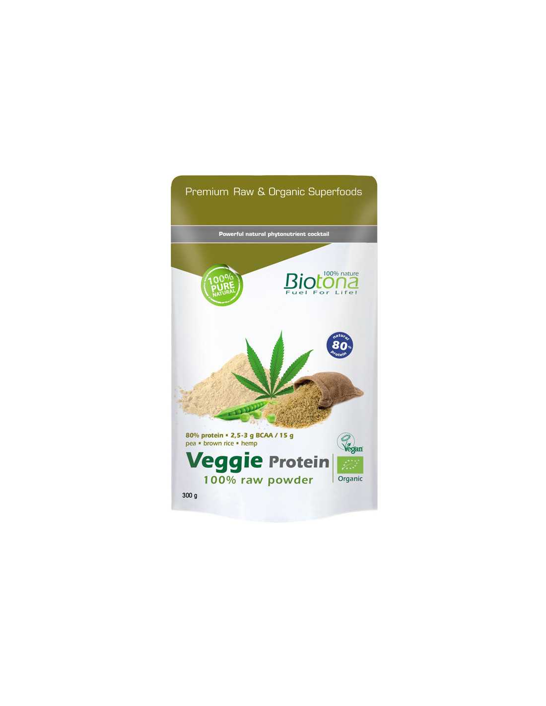 Biotona Bio Veggie Protein Raw (80% de proteínas) es un complexe equilibrado de excelentes fuentes vegetales de proteínas que proporciona un espectro completo de aminoácidos debido a la combinación de una fracción proteica concentrada de arroz integral (con un perfil de aminoácidos que se aproxima mucho al de la leche materna), polvo proteinado de guisantes y semillas de cáñamo. Biotona Veggie Protein ha sido concebido especi- almente para responder a las necesidades proteicas de vegetarianos y vegetalianos, deportistas o personas que busquen una fuente de proteínas alternativa, vegetal y de alta calidad para un uso diario. Biotona Veggie Protein contiene por porción de 15 g alrededor de 3 g de BCAA. Los BCAA constituyen el 40% de las proteínas del orga- nismo, son inmediatamente absorbidas en el flujo sanguíneo y distribuidas directamente en el tejido muscular.INGREDIENTES