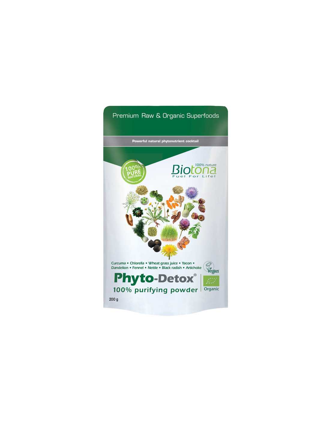 BiotonaBiotona Bio Phyto-Detox® es una mezcla sinérgica de polvos de plantas 100% biológicas y secadas al aire libre. Las semillas del cardo mariano apoyan al hígado en su función desintoxicante y depurativa. La cúrcuma participa en una buena digestión de las grasas. La chlorella es un alga milenaria de alga dulce, unicelular, de color verde vivo, debido a su elevado contenido en clorofila y alberga un alto y precioso contenido en fito-nutrientes. Igual que el polvo del jugo de la hierba de trigo. La raíz de diente de león contribuye a la purificación interna del organismo y las semillas de hinojo ayudan a disminuir la sensación interna de estar hinchado. El yacón boliviano, o pera de tierra, contiene mas de 40% de inulina (fibras solubles). La hoja de alcachofa apoya al hígado y el proceso de desintoxicación en general.Biotona Phyto-Detox® se recomienda como un aporte diario en nuestra dieta oc- cidental, demasiado rica en grasas, o en curas desintoxicantes.