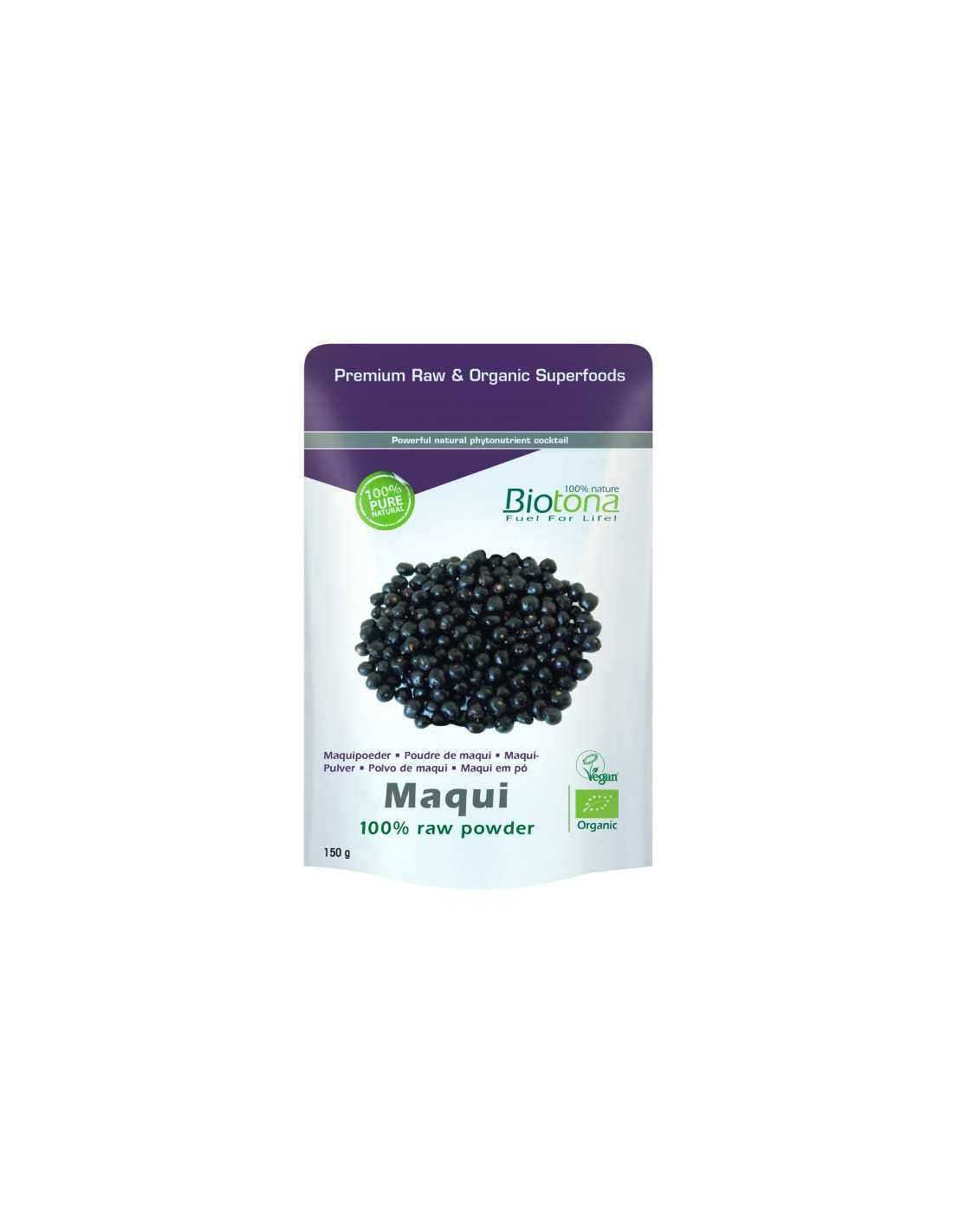 Biotona Bio Maqui Raw es un sublime polvo de minúsculas bayas negro-violáceas que crecen de forma abun- dante en arbustos de hoja perenne en Patagonia, Sur de Chile y en Argentina. Estos frutos de gusto delicioso se consideran el secreto milenario y mejor guardado de los indios Mapuche. Esta población autóctona resistió durante mucho tiempo en la región a los invasores, posiblemente debido a su capacidad de resistencia excepcional debida a un elevado consumo de té de maqui. El color violeta oscuro del polvo se debe a las antocianinas que contiene, substancias producidas para protegerse contra los factores externos extremos. Las bayas de maqui de Biotona se recogen en estado silvestre en el bosque Amazónico de Chile. Después de la recolección y una selección rigurosa, se reducen inmediatamente a polvo por un proceso de liofilización que permite conservar al máximo el sabor, el olor y el color de los frutos frescos, así como las sustancias y fitonutrientes presentes de forma natural.