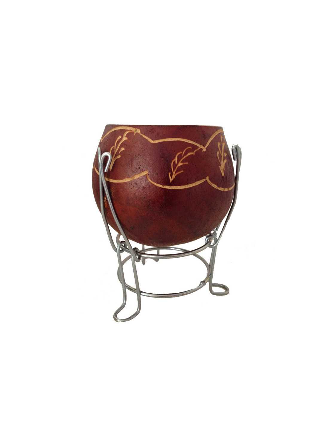 Mate tallado a mano hecho artesanalmente con calabazas naturales. El producto tiene una estructura metálica que le sirve de sujeción y de pie para poder apoyarla en superficies planas. Ideal para infusiones.