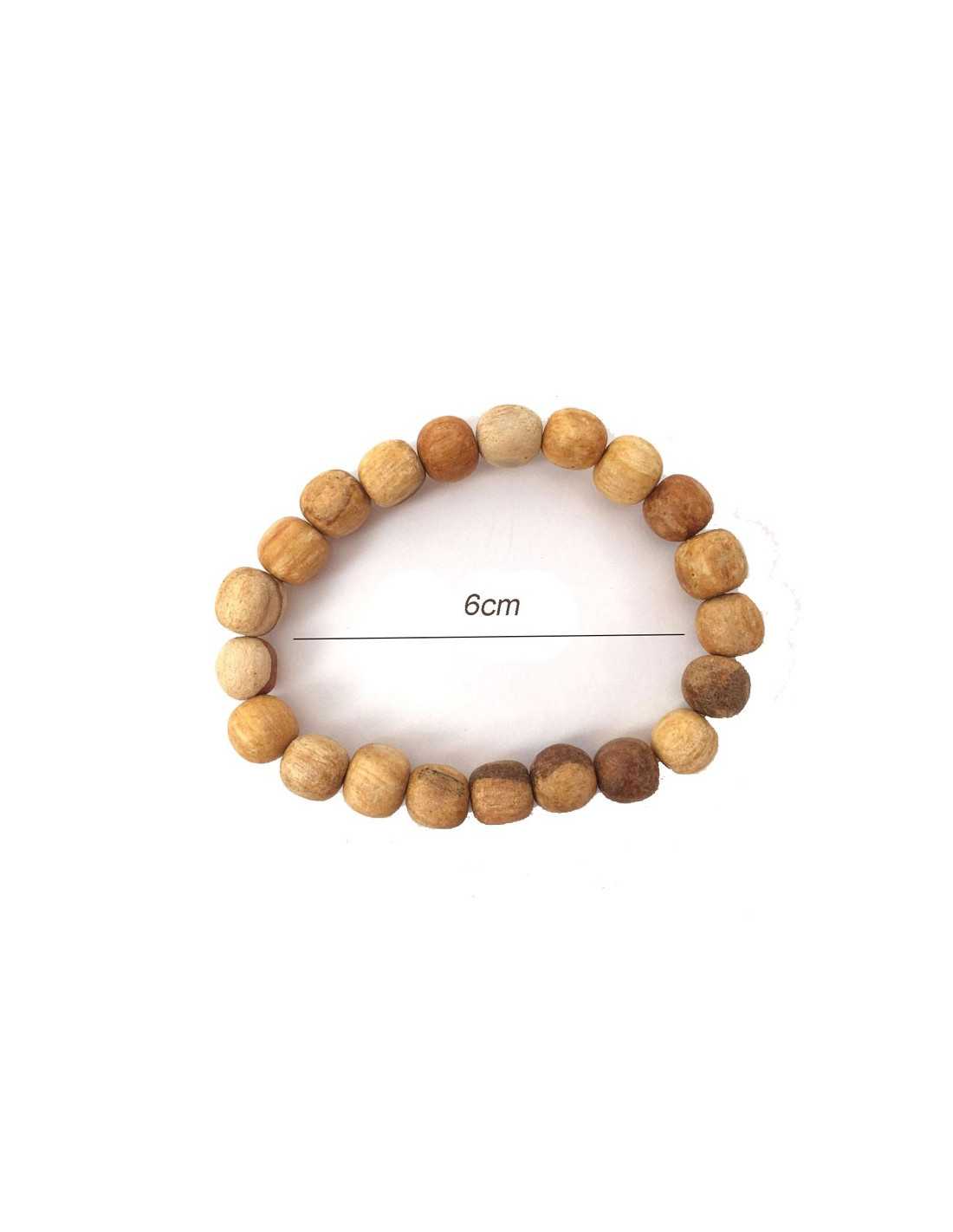 La pulsera esta formada por 18 bolas macizas de palo santo y un diámetro de 6 centímetros. La pulsera es elástica por lo que puede agrandar su tamaño.