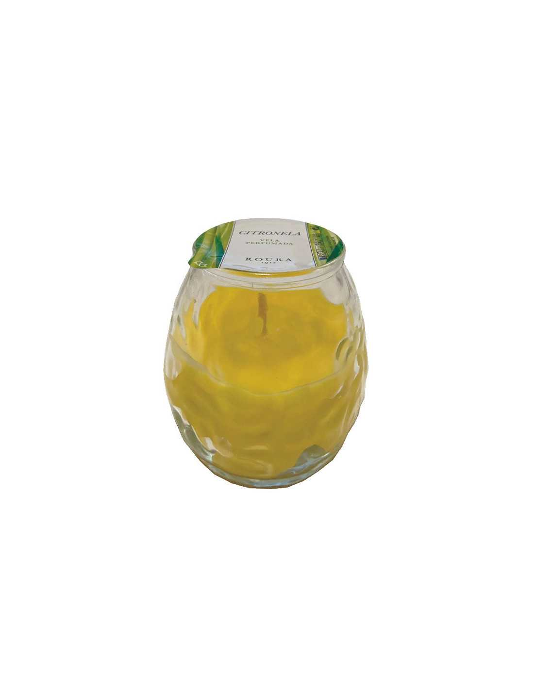 Vela en vaso de cristal de color transparente, con cera amarilla y perfume de citronela.
