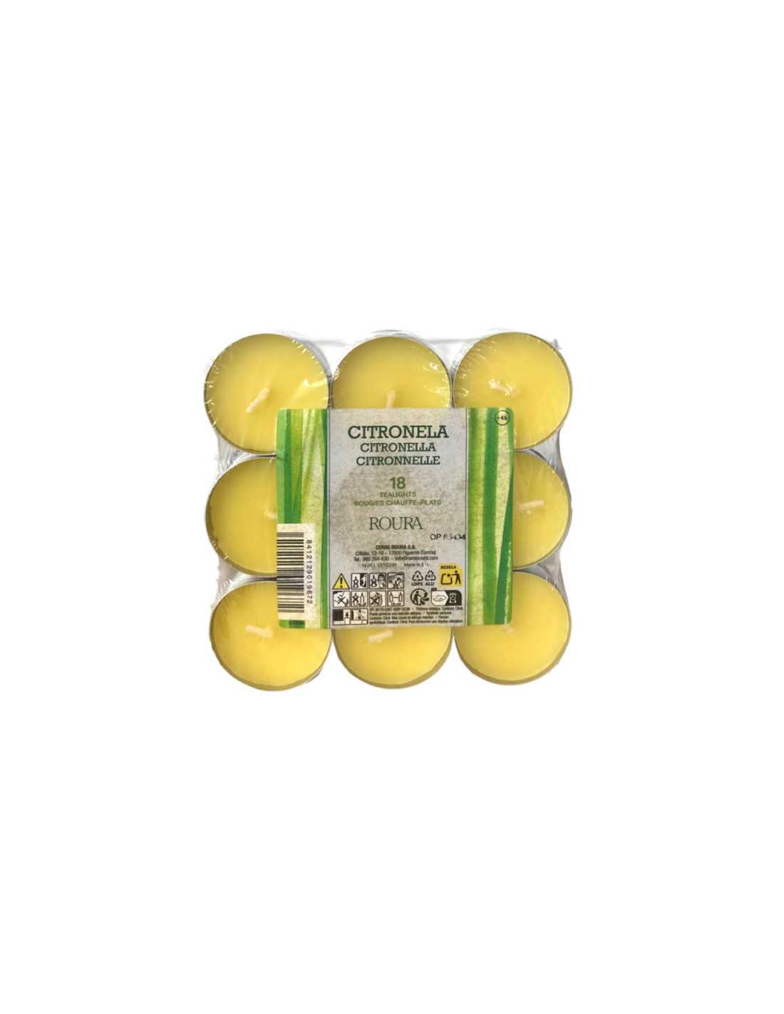 Pack de 18 velas perfumadas con citronela, ideales para mantener alejados a los mosquitos mientras perfuman suavemente el ambiente. Fabricadas con parafina de color amarillo, son perfectas para disfrutar de cenas o reuniones al aire libre sin molestias.