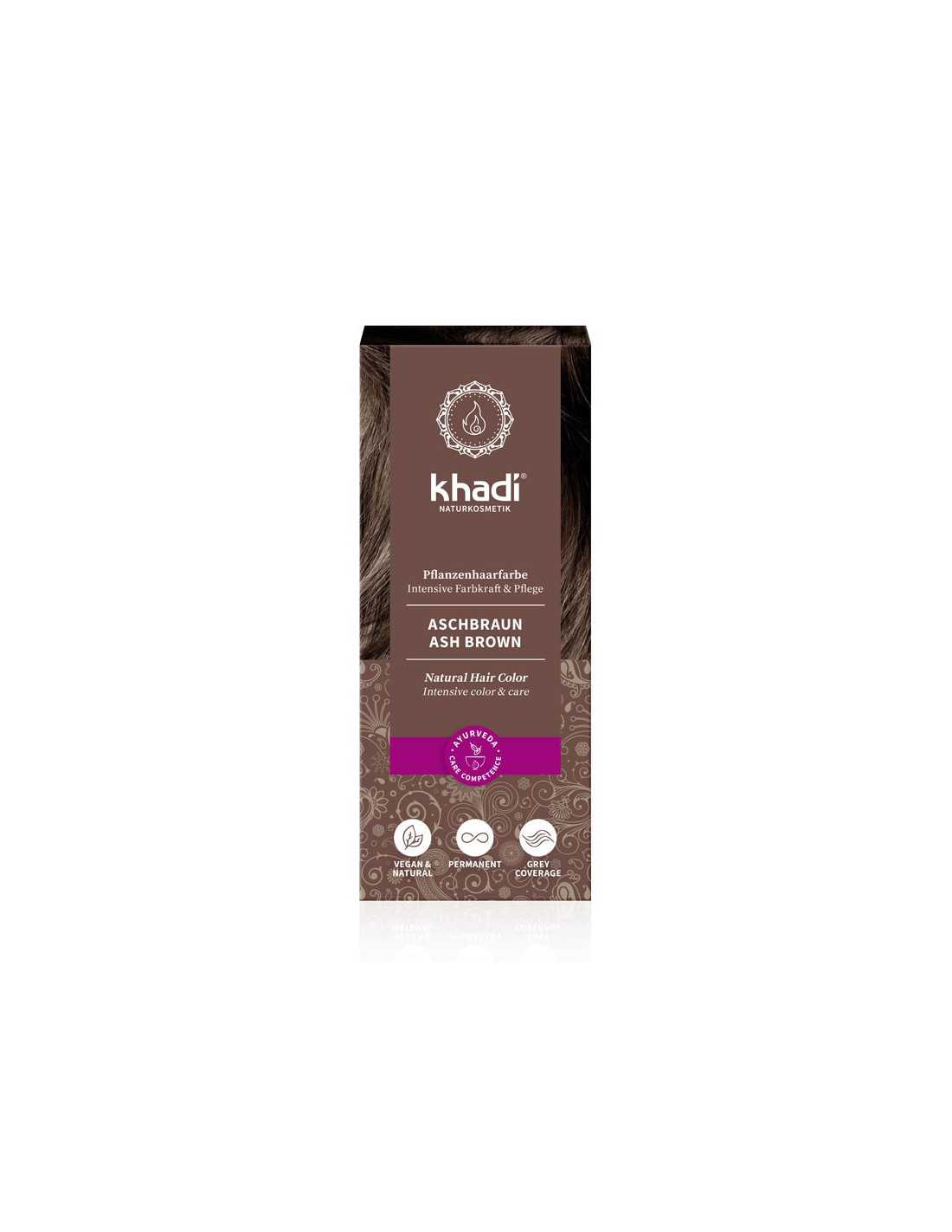 Hermoso color castaño medio mate, sin matices rojizos. khadi Ash Brown tiñe tu cabello de un color castaño medio mate y ceniciento, de forma totalmente natural. El resultado depende de tu color de cabello inicial: el resultado individual varía desde un tono cappuccino suave y cremoso hasta un marrón café intenso y fuerte. Los ingredientes herbales de alta calidad proporcionan a tu cabello reflejos de color intensos y un cuidado rico, ¡color, volumen y brillo en un solo paso! El índigo y la henna ofrecen un color vibrante y duradero, cubriendo muy bien los cabellos blancos y grises. Los pigmentos herbales envuelven cada hebra de cabello como un esmalte de color protector. Mientras que el amla, el bhringaraj y el neem aportan brillo y volumen. Tiñe de un castaño medio mate y ceniciento excelente cobertura, incluso en cabellos grises proporciona brillo radiante y volumen natural nutre y fortalece el cabello y el cuero cabelludo 100% natural y vegano.