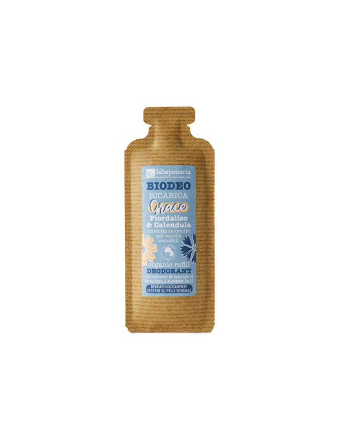 Gel de recarga de desodorante para axilas sensibles a base de aciano y caléndula. Esta recarga no tiene ningún tipo de perfume, más allá de los aromas naturales de los ingredientes, esto es porque este producto esta testado para personas de pieles sensibles.