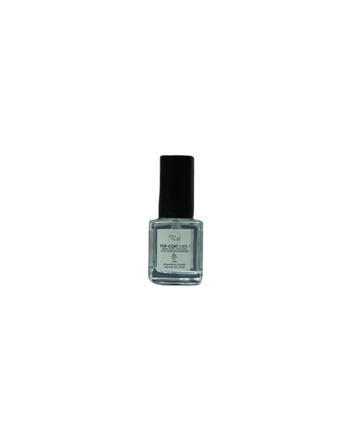 Este esmalte top coat 3 en 1 de Born to Bio actúa como base, top coat y endurecedor. Aplicado antes del color, protege la uña; tras el color, sella y da brillo; usado solo, fortalece uñas débiles o estriadas. Formulado con aceite vegetal de goji y extracto de arándano, contiene un 93% de ingredientes naturales. Rinde como protector y fortalecedor, reduce la tinción del color y aporta un acabado brillante.