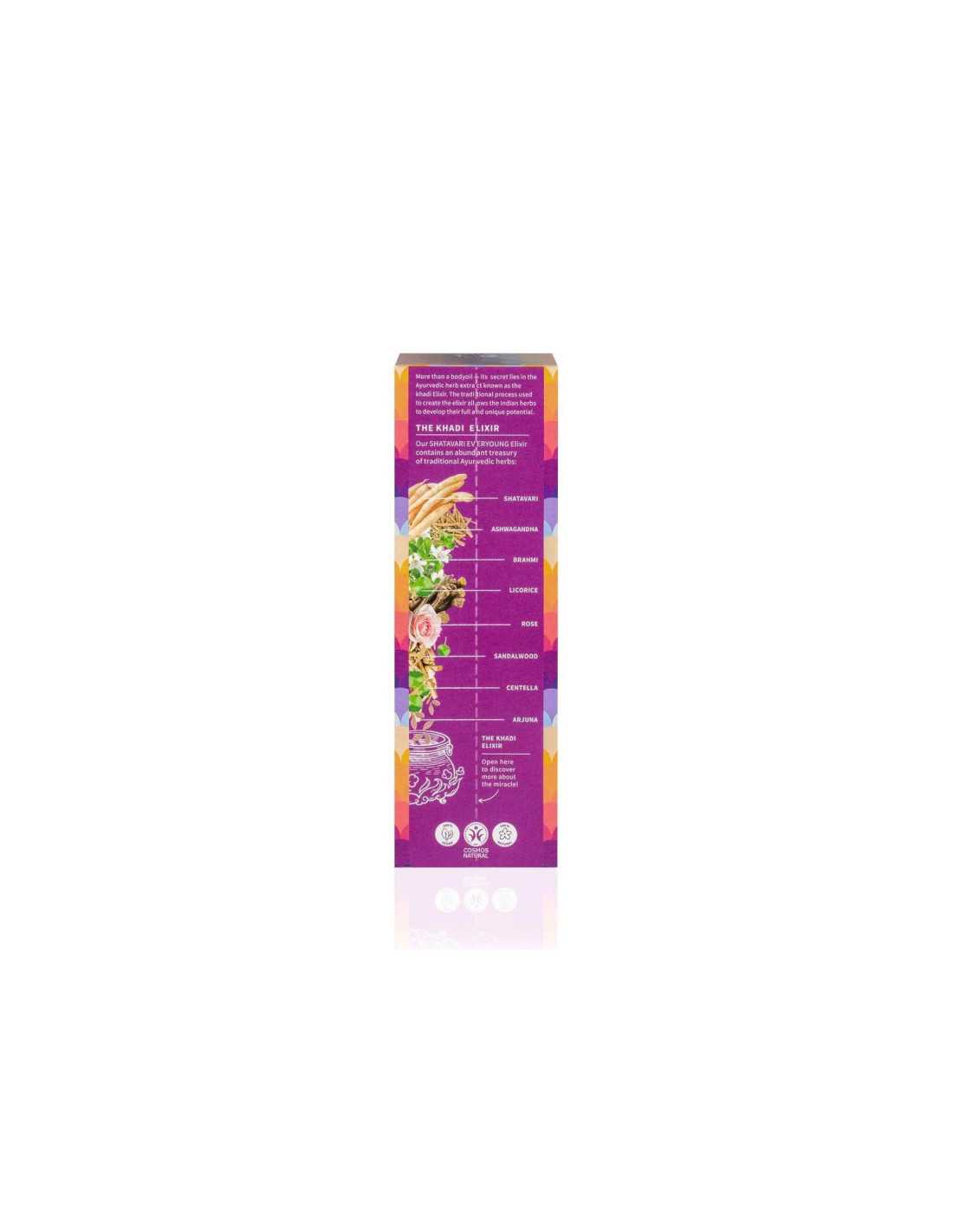 El Elixir Ayurveda Shatavari Anti-Edad de Khadi es un aceite corporal natural que aporta un efecto rejuvenecedor y regenerador celular. Su fórmula ayurvédica tradicional, 100% natural y vegana, combina Shatavari, Ashwagandha y sándalo, considerados en Ayurveda como fuente de juventud y vitalidad, junto con otras plantas medicinales que hidratan, nutren y mejoran la elasticidad de la piel. Ideal para pieles maduras, secas o cansadas, este aceite antiedad tonifica y proporciona una hidratación profunda.