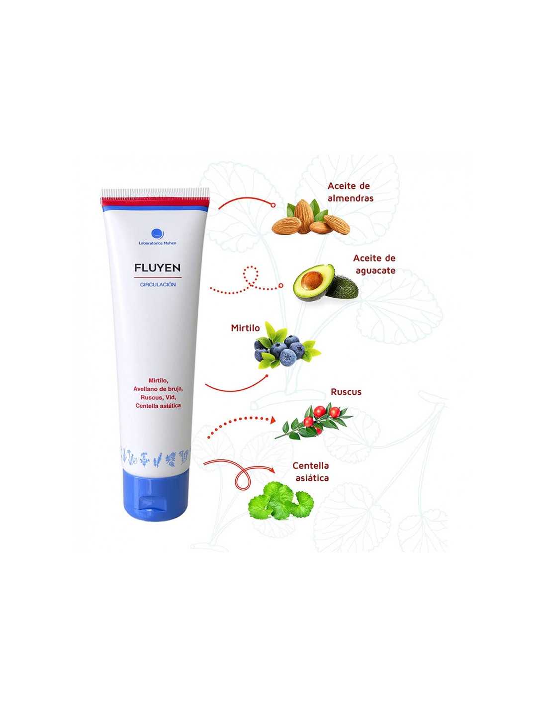 El aceite de almendras dulces y el aceite de aguacate hidratan y suavizan la piel, mientras que el mirtilo, el ruscus y la centella asiática contribuyen a mejorar la circulación y fortalecer las venas. Estos ingredientes combinados confieren a Fluyen Crema una alta eficacia en el alivio de los síntomas asociados a las venas varicosas.