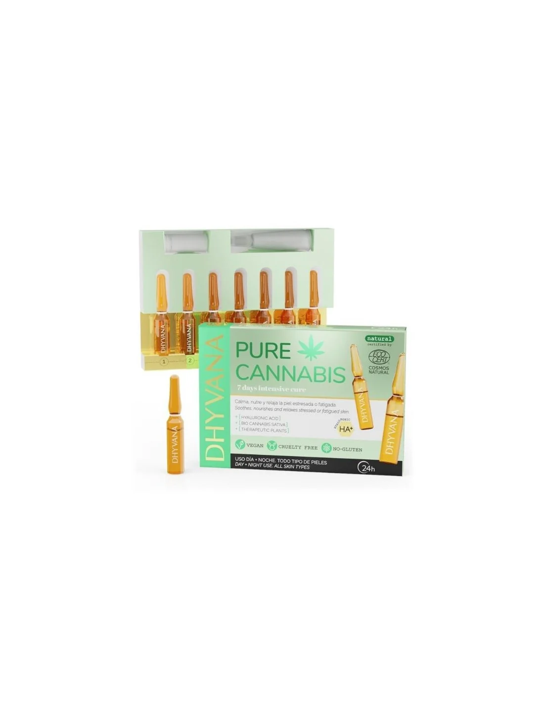Ampollas ultra-concentradas con Ácido Hialurónico, Cannabis Sativa ECO y Botánicos Terapéuticos calmantes de Aloe Vera, Camomila y Cola de Caballo. Calma, nutre y relaja la piel estresada o fatigada.Anti-arrugas, efecto rellenador. Bio Cannabis anti-estrés. Reduce rojeces, irritación y previene el envejecimiento cutáneo.Perfecto para piel estresada o fatigada.
