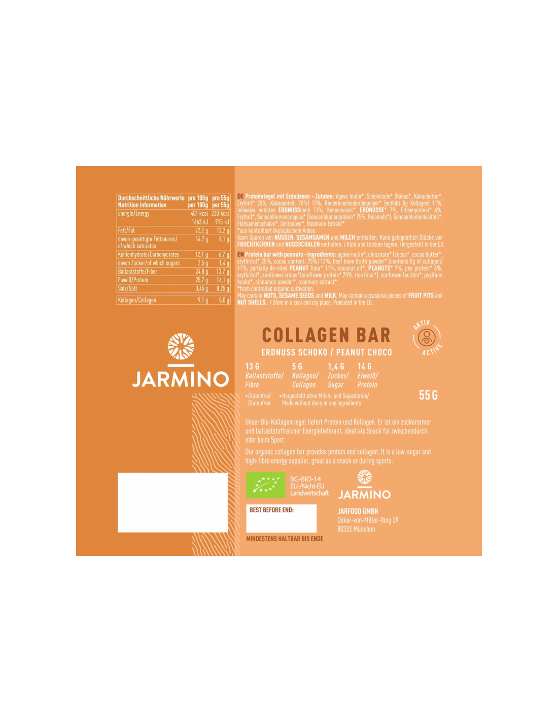 Barrita de Colageno Cacahuetes y Cacao BIO 12x55g Jarmino