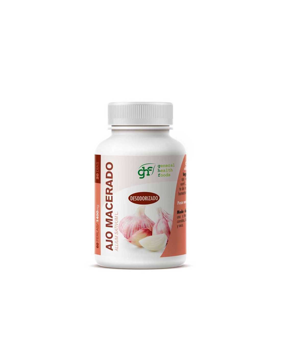 Perlas de ajo macerado y desodorizado de la marca GHF. Los efectos saludables del ajo son conocidos desde la antigüedad, llegando a ser calificado de "divino" por los egipcios.El ajo es un antiséptico, regulador de la tensión arterial (efecto vasodilatador) y preventivo de la ateriosclerosis regulando la formación de colesterol y triglicéridos. Es un antibiótico natural que inhibe el crecimiento de hongos y bacterias causantes de problemas respiratorios e intestinales.También resulta útil en infecciones genitourinarias ya que sus componentes antibióticos se eliminan por vía renal.