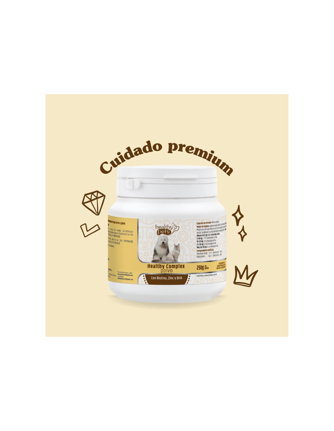 Healthy Complex Pelo Sano de Healthy Pets es un suplemento nutricional diseñado para fortalecer y mejorar la salud del pelo y la piel de perros y gatos. Su fórmula está enriquecida con levadura de cerveza, biotina, zinc, DHA y vitaminas, proporcionando los nutrientes esenciales para mantener un pelaje brillante, fuerte y libre de caspa o picores.