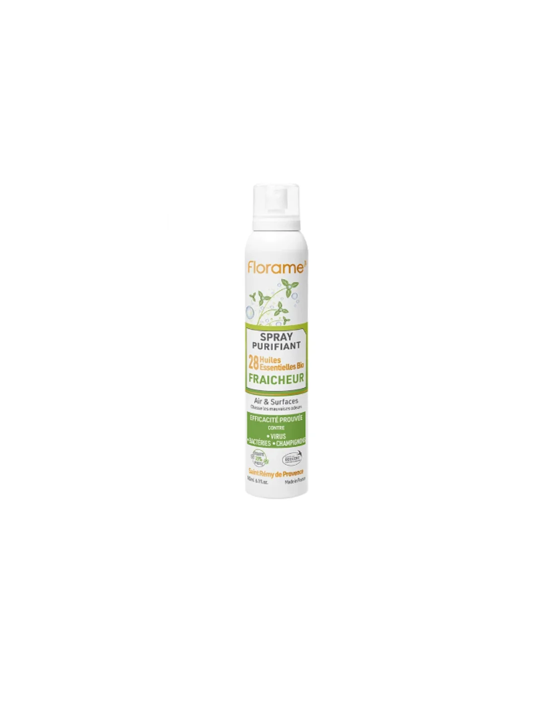 El Espray purificante Frescura de Florame te ayuda a mantener tu hogar limpio y libre de bacterias, virus y hongos.La sinergia de 28 aceites incluyendo Menta, Eucaliptus globulus, Gaulteria, Trementina, Naranja Dulce y Romero alcanforado libera una fragancia delicada y fresca. Este espray purifica el aire y las superficies de tu hogar. Deshazte de bacterias, hongos y virus.Eficacia probada contra: Bacterias (AFNOR NF EN 1040). Hongos (AFNOR NF EN 1275). Virus (AFNOR NF EN 14476 con cepa tipo 5 del Adenovirus).MODO DE USO: Pulveriza de 3 a 8 veces según el tamaño de la habitación a tratar y asegúrate de cubrir la máxima superficie al pulverizar. Utilizar 1 a 3 veces al día. Dejar pasar como mínimo 2 horas entre una aplicación y la siguiente. Dejar actuar durante al menos 15 minutos antes de abrir y ventilar la habitación. Esperar 15 minutos después de concluido el proceso para dejar entrar a niños en la habitación.